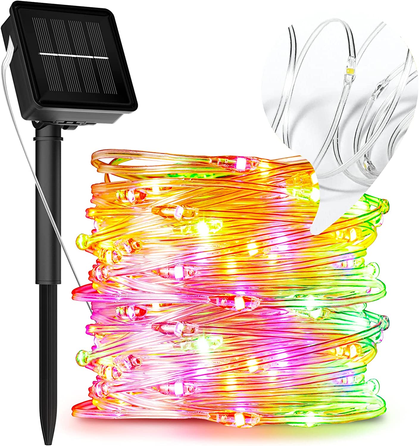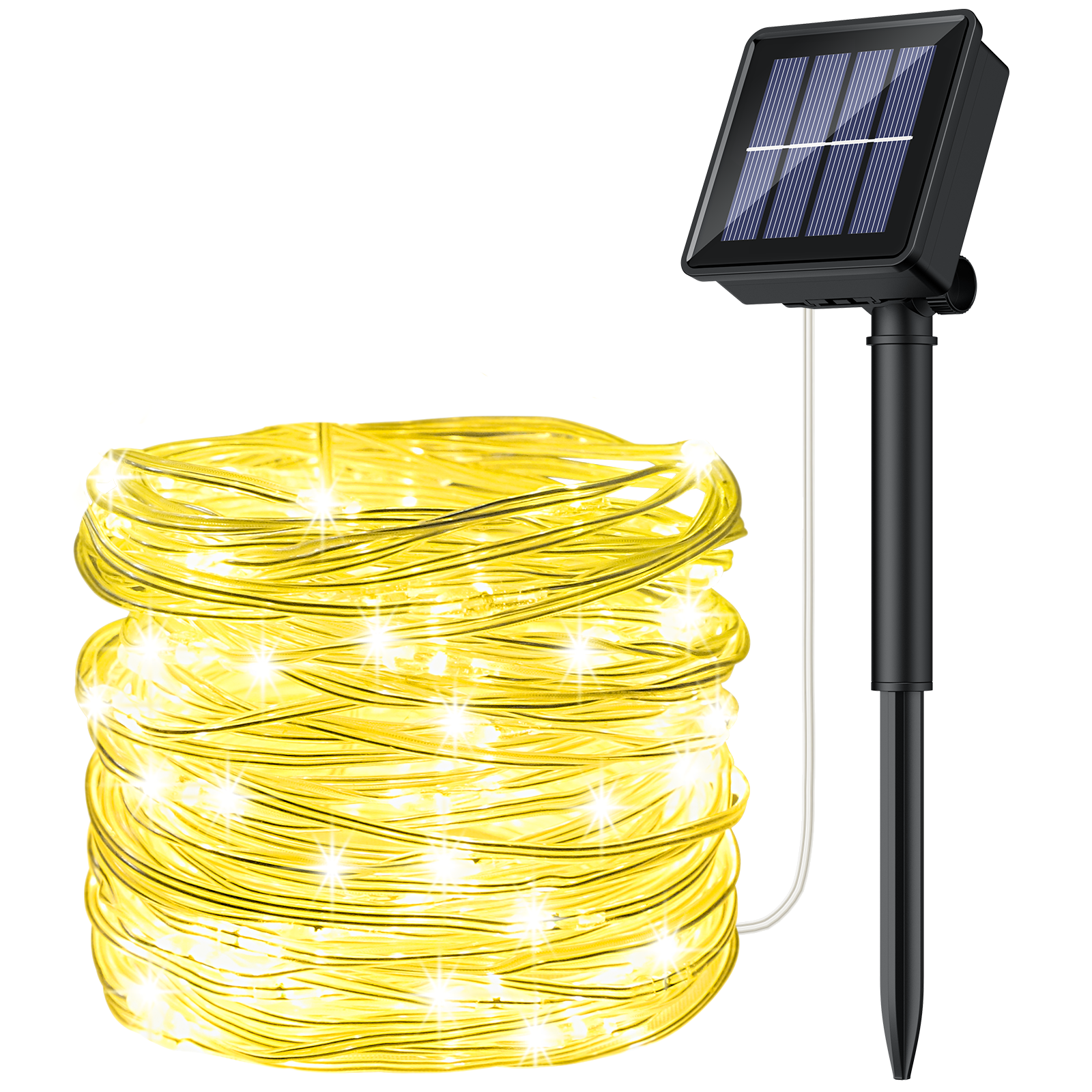 Los paneles solares que activan las luces son pequeños, pero efectivos. Se colocan sobre un palito que puede pincharse en una maceta o jardinera. Detrás de cada panel hay dos botones: uno de encendido (on/off) y otro con 8 patrones distintos de iluminación (fijo o con diferentes modos de parpadeo). Se cargan durante el día con la luz solar y de noche, las luces se encienden solas si estan en modo ON y se desactivan solas cuando amanece. Duran unas 8h. El cable donde están insertadas está plastificado, por lo que las luces están bien protegidas de la intemperie y se adaptan muy bien a todas las superficies. La luz que emiten es tenue, pero suficiente para convertir cualquier jardín o terraza en un lugar encantador. Recomiendo la compra!